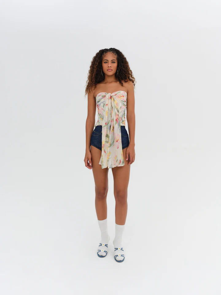 Evoking the soft waves of summer tides, the Abby multicolor strapless top is crafted in a pleated crinkle chiffon featuring a watercolor floral print for an allover ripple effect. The perfect summer top, it features an internal corset with boning, allover ruching, and a fixed knot at the front with oversized chiffon ties that cascade downwards.