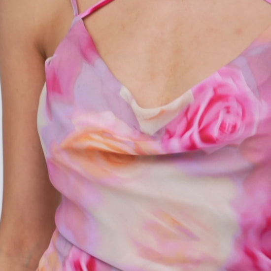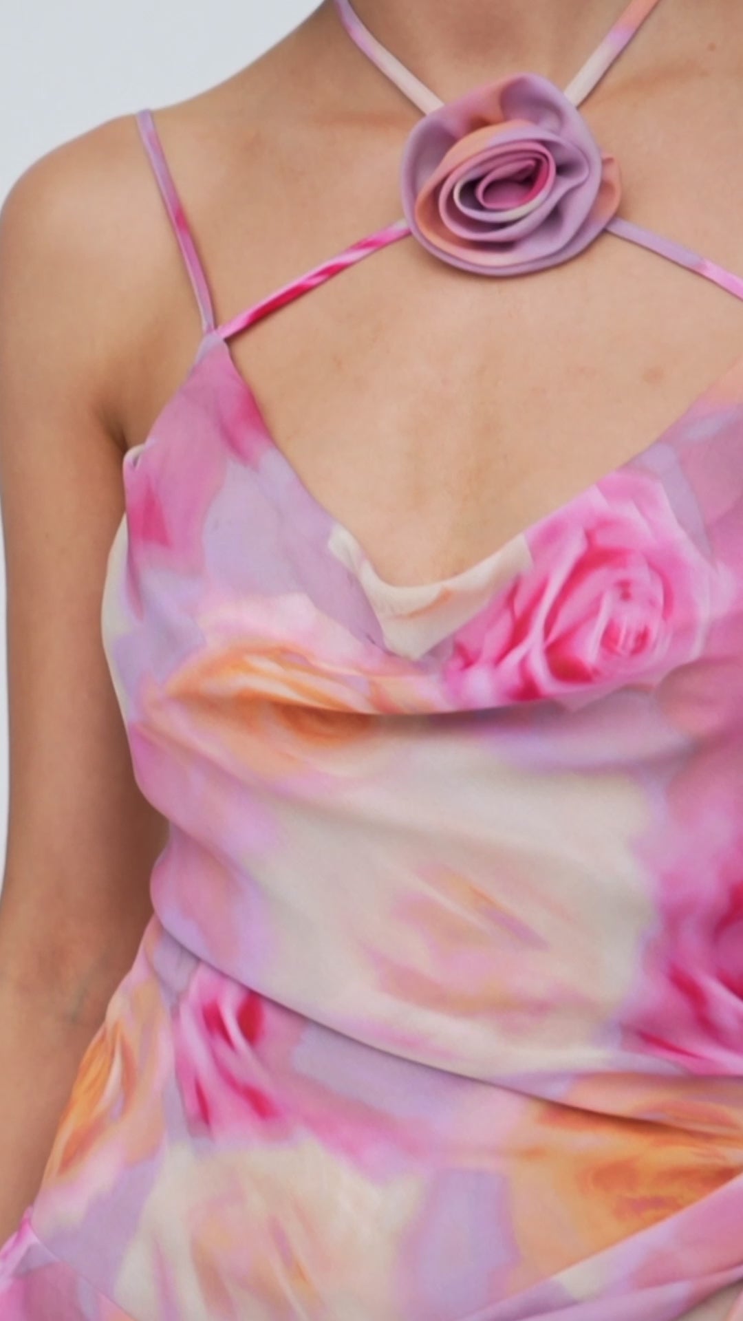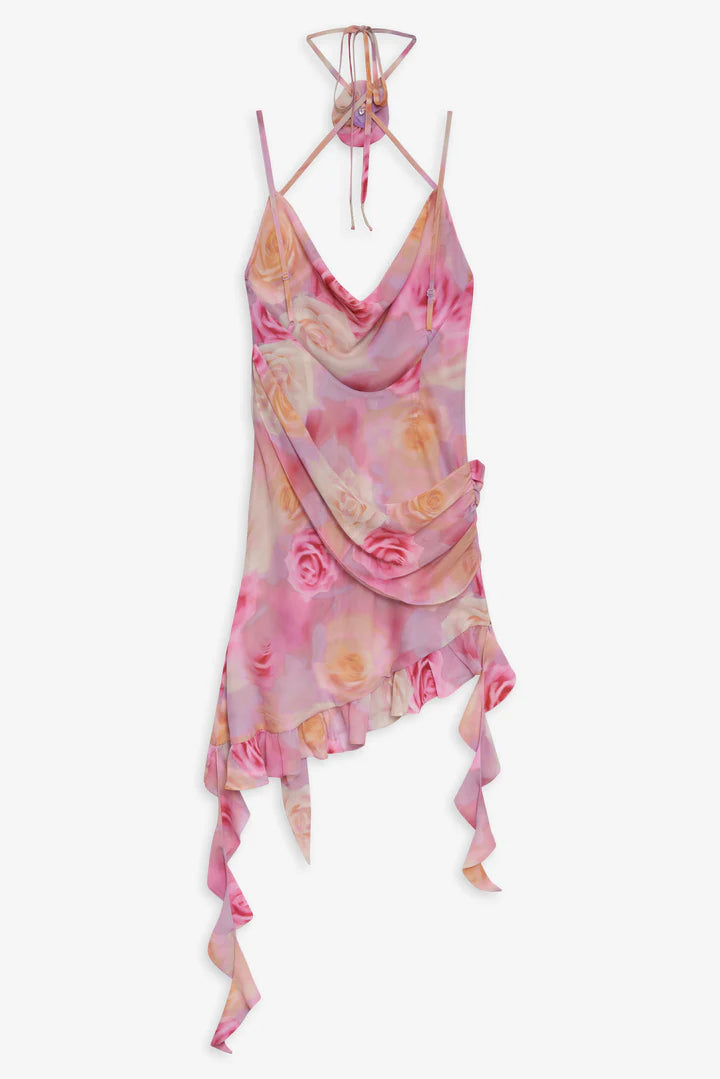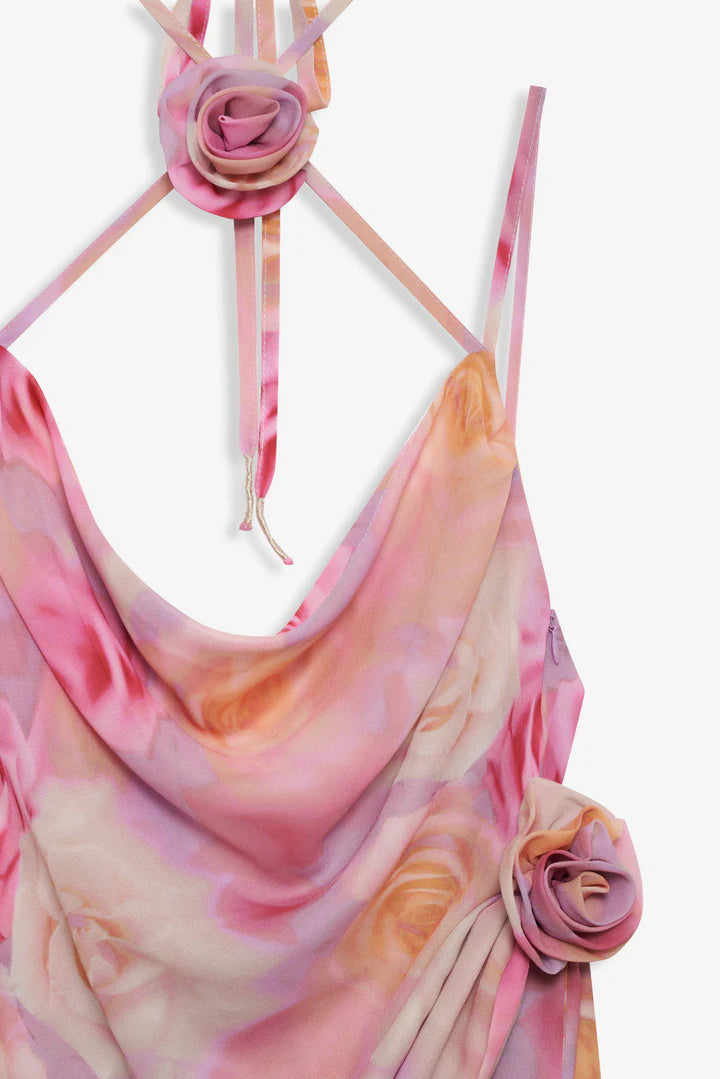 Crafted a dreamy rosebud printed chiffon, the Beate floral mini dress is a fun and flirtatious pink dress for all your Galentine's day events. This asymmetrical dress features a flattering cowl neckline, fixed rosettes at the hip and front neck, and cascading ruffles which pile on the romance.