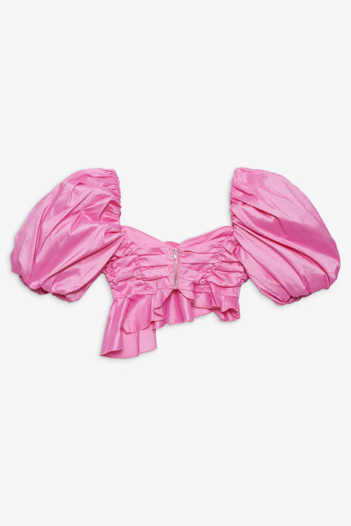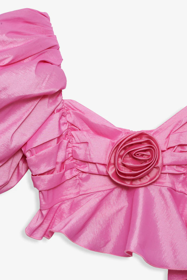 You'll be the dream date in the Judith crop blouse—a pink puff sleeve crop top featuring a fixed large rosette at the center front, romantic elbow-length puff sleeves, and an asymmetrical ruffle hem.